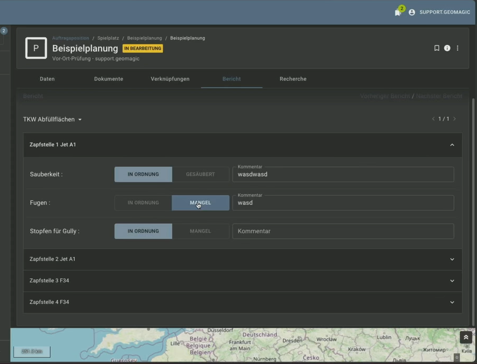 Die Servicetechniker der Gastdienstleister haben in einem regelmäßigen Zeitintervall all die Bestandteile der Fernleitungsinfrastrukturanlagen besucht und geprüft. Die Überprüfung wird in einem Formular festgehalten. Sie können dann auch Teile der Anlage, die Sie geprüft haben, als mangelhaft markieren und daraus wird automatisch eine Meldung erstellt.